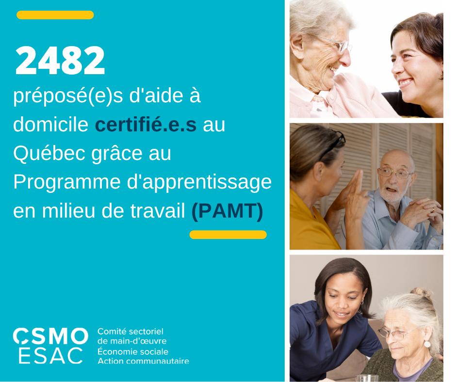 À la demande des entreprises d’économie sociale en aide à domicile (EÉSAD), le CSMO-ÉSAC a développé une norme professionnelle et un programme d’apprentissage en milieu de travail (PAMT) pour le métier de préposée d’aide à domicile, tous deux lancés en novembre 2009.
